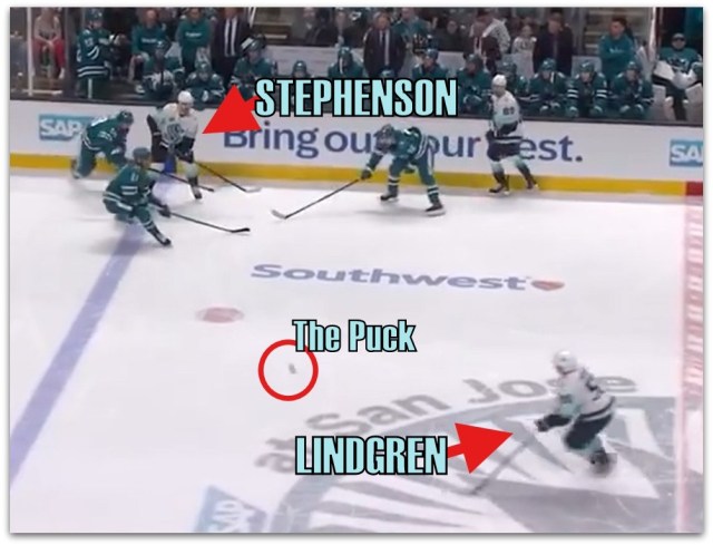 Stephenson drew the primary assist on defenseman Ryan Lindgren’s goal early in the 3rd period that proved to be the game-winner. As the KHN screengrab below shows, Stephenson held onto the puck at the San Jose blueline until three Sharks converged. That allowed open ice for his pass to Lindgren, whose shot after entering the zone deflected off Shakir Mukhamadullin and past goalie Yaroslav Askarov.