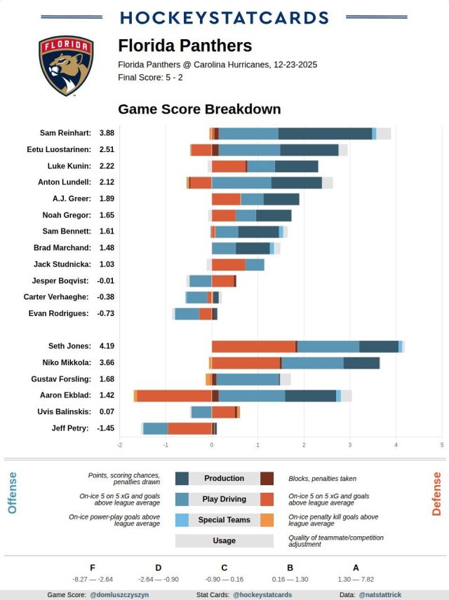 After sleep-walking through the first two periods, the Panthers woke up after getting a stern reading from naughty list of head coach Paul Maurice. The Cats impressively reeled off four goals in a 6:04 span to post their second comeback win over Carolina in less than a week, upping their road record to 8-7 in the process. Florida collected its 20th win and will break for the holiday on a 8-2 run that sees them holding down Wild Card 2 in the ever-changing world of the Eastern Conference playoff race until at least this weekend.