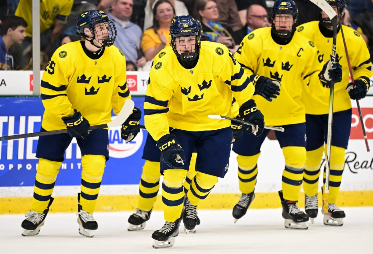 FRISCO, TEXAS – APRIL 26: Sweden’s Ivar Stenberg #15 skates to the bench with teammates after scoring a first period goal against USA during Preliminary Round – Group B action at the 2025 IIHF Ice Hockey U18 World Championship at Comerica Center on April 26, 2025 in Frisco, Texas, USA. (Photo by Micheline Veluvolu/IIHF)