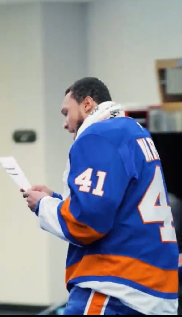 The memorable evening began even before puck drop, when the rookie defenseman was tapped to read the starting lineup in the Islanders’ locker room. (Courtesy cell phone screenshots
