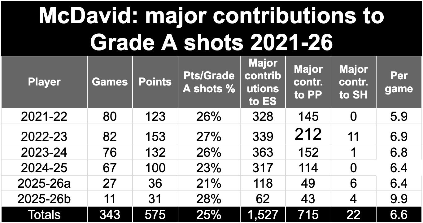 In the 11 games since the Wild loss, McDavid has scored 31 points, averaged 4.0 Grade A shots on net himself, and made major contributions to 9.9 Grade A shots per game.
