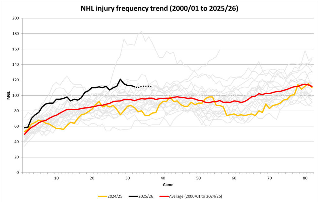 Starting with preseason injuries to top names like Matthew Tkachuk and Aleksander Barkov, up until now, injuries have been a massive storyline so far this season. It isn’t just your imagination as NHL Injury Viz highlighted last week how the 2025-26 season (black line) is far ahead of 2024-25 (yellow line) in terms of Man Games Lost through each team’s first 32 games, and far ahead of the 24-year average from 2000-2025 (red line):