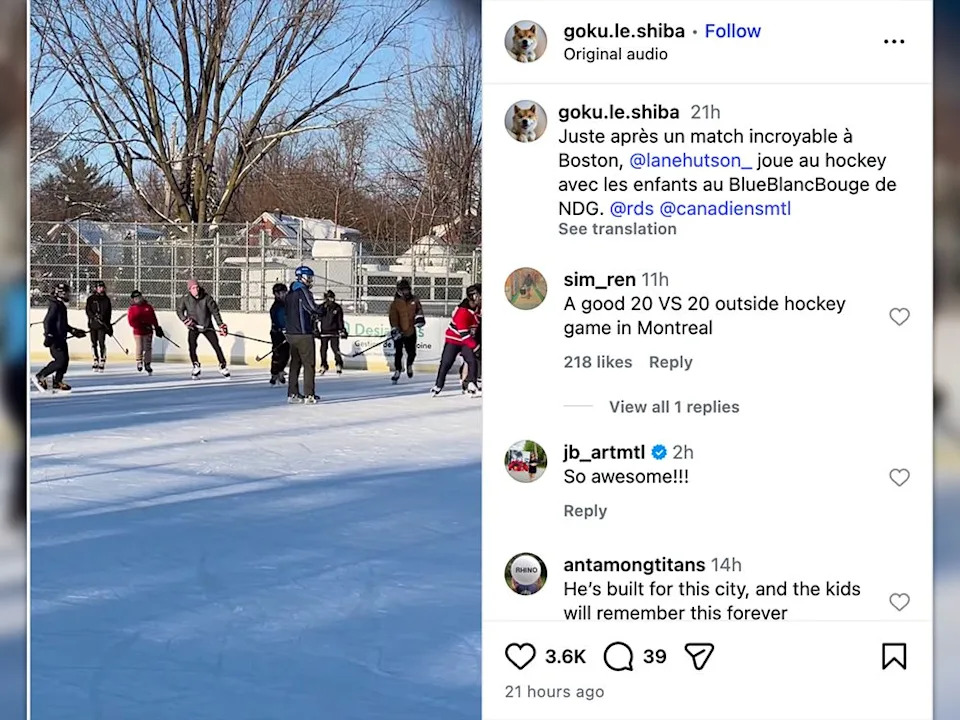 The Montreal Canadiens may be on a winter break, but that didn’t keep Lane Hutson off the ice Wednesday, when he joined a group of kids for a game of shinny.