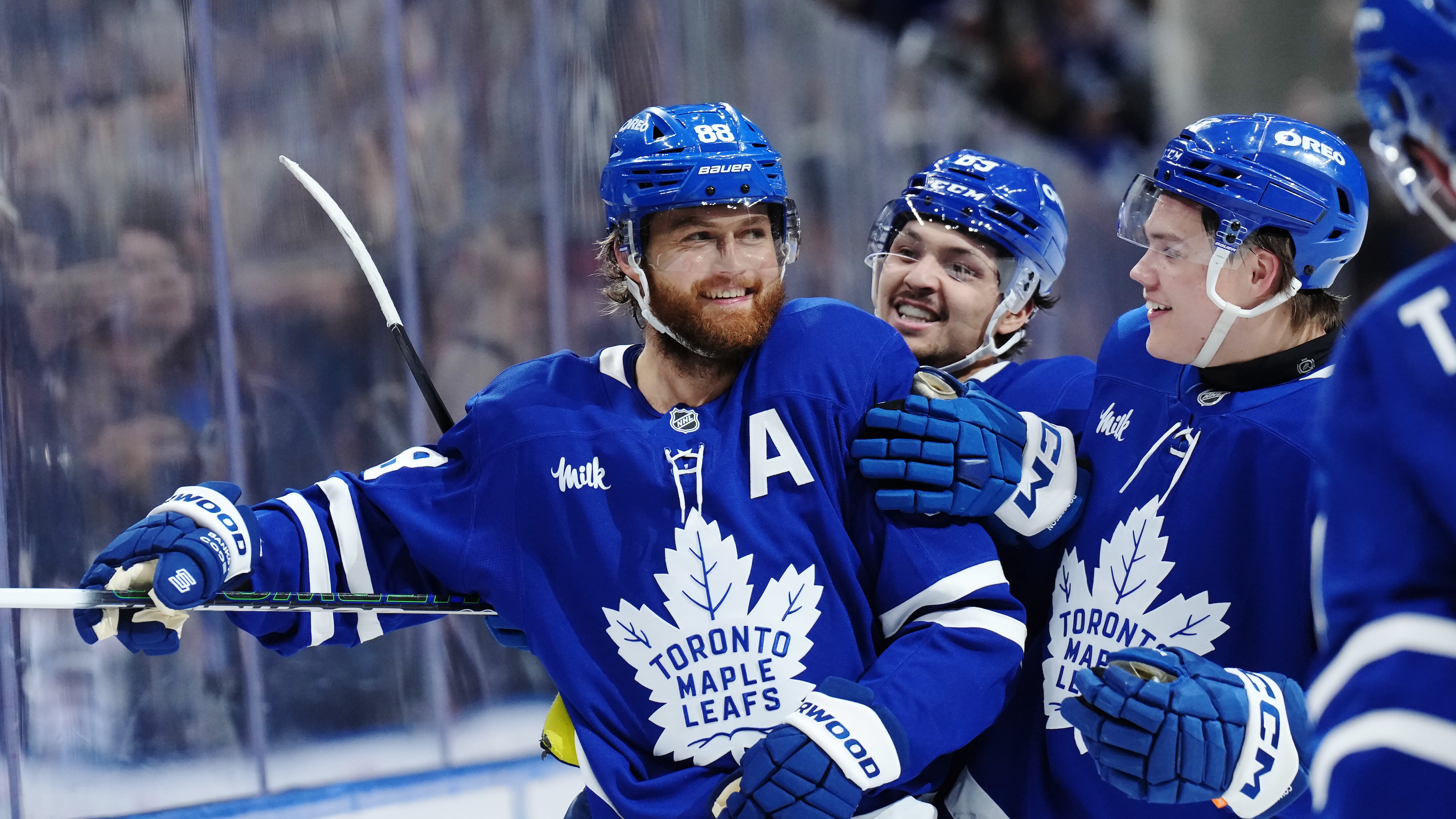 Toronto Maple Leafs’ William Nylander (88) celebrates his game-winning goal against the St. Louis Blues during overtime NHL hockey in Toronto on Tuesday, November 18, 2025. THE CANADIAN PRESS/Nathan Denette (Nathan Denette/THE CANADIAN PRESS)