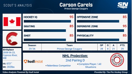 Carels is a prospect on the rise, an outstanding skater with exceptional hockey sense. He can be trusted in all situations. Carels closes on opponents physically, moves pucks responsibly and can create offence. He’s a complete player who has produced eight goals and 21 assists in 28 games for the Prince George Cougars in the WHL.
