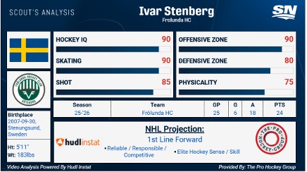 Stenberg is challenging for the top draft slot and producing at a historic rate, playing for Frolunda in Sweden’s top pro league, the SHL. He’s produced six goals and 18 assists in 25 games.