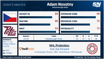 It took some time for Novotny to find his stride in North America, but he’s settled in nicely and produced 19 goals and 16 assists in 29 games for the Peterborough Petes (OHL). Novotny provides a combination of power and skill. He has a lethal release when the puck ends up on his stick in high-danger areas. A productive WJC will increase his stock as he continues to trend upward as a top prospect for the 2026 NHL Draft.