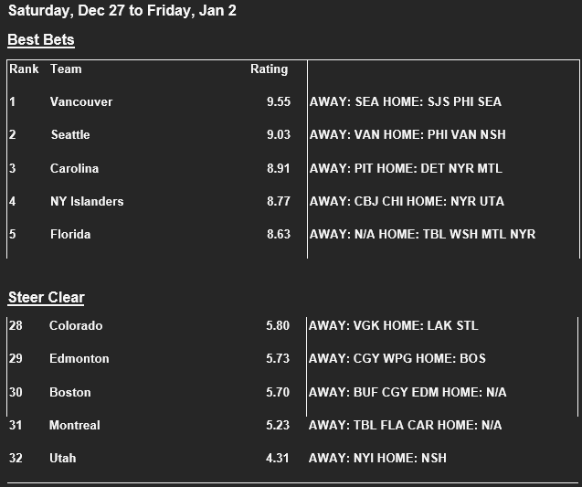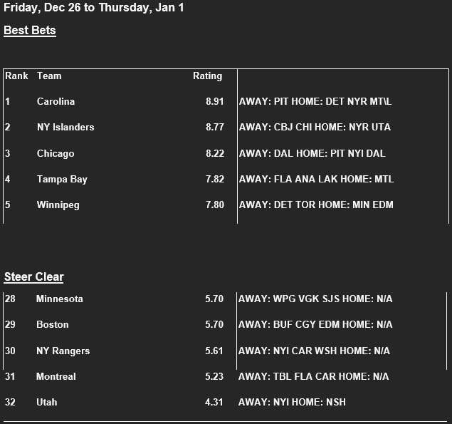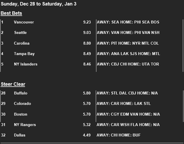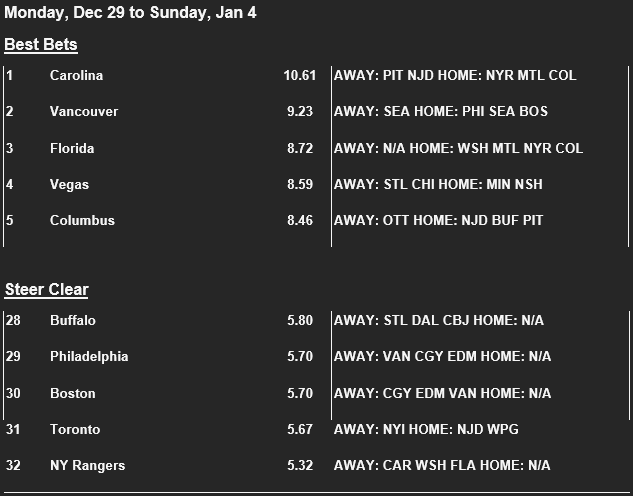 Analyzing the upcoming week’s schedule and looking at which NHL teams are expected to have a strong week and who will be in tough. Which teams’ players should you be buying stock in, and which teams should you avoid at all costs? Take a peek at the NHL team outlook for the upcoming week.