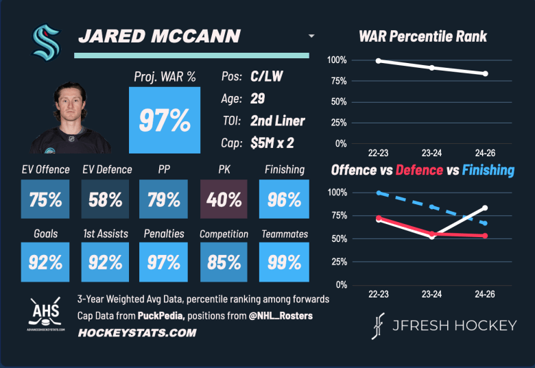 McCann, while not fast by any means, is a pretty solid skater. While being more of a winger now, he has shown to play centre when called upon. McCann has scored at least 60 points in each of the last three seasons, one of which included a 40–30–70 campaign. McCann’s been a major contributor of Seattle’s offence, particularly this season, carrying a 58.75 xG%. The Kraken as a whole have a xG% of 44.36. Without him, they are a lottery team.