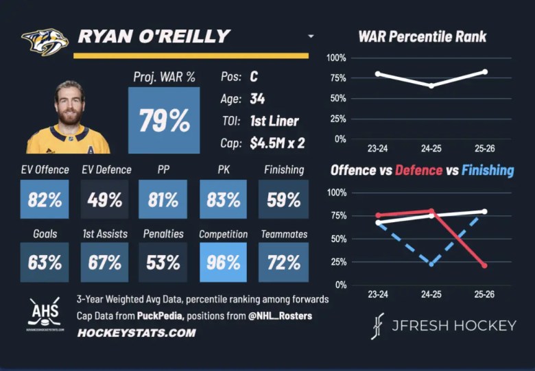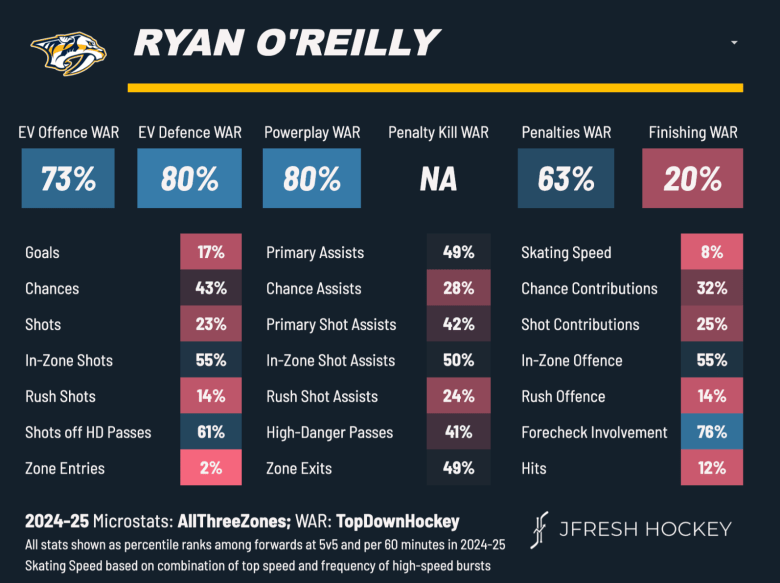 O’Reilly has some very strong underlying metrics as well. Currently, he’s boasting a 55.83 xG% and a GF% of 55.81. This means he literally isn’t overachieving whatsoever. The scoring chances for are in favour of him clipping at a 55.06% rate, he has a HDCF% of 58.05, a HDGF% of 60 and rocking a tiny PDO boost at 1.013.