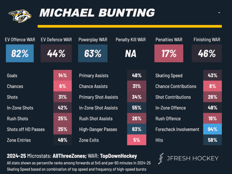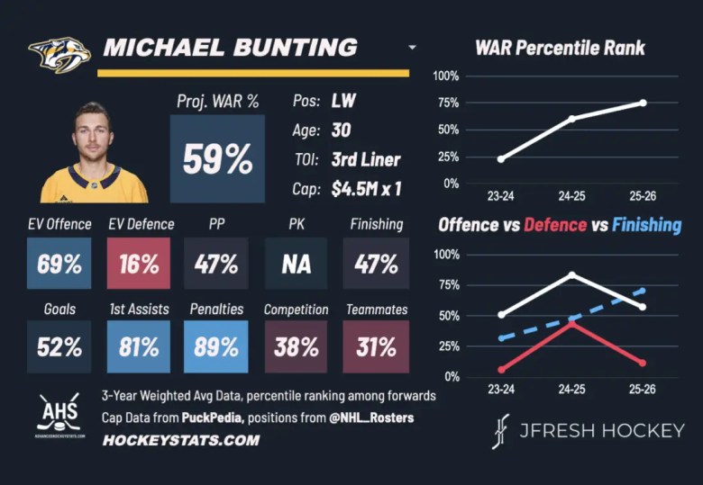 Bunting’s underlying numbers are all in the low 50’s so he’s pretty much an average third liner in this league. Being a UFA at a 4.5M cap hit, I think the price to obtain him would actually be pretty low. Maybe a third-round pick? I think I’d take that bet at a 50% retention.
