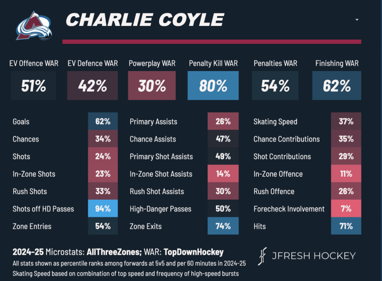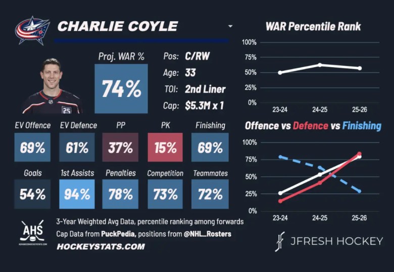 Up until 2024–2025, Coyle was an elite 3C and a good 2C during his time with Minnesota and the Boston Bruins. A very bad season for him and Boston in 2024 resulted him being sent to Colorado and then flipped to Columbus in the offseason after having one goal in seven games against the Dallas Stars.