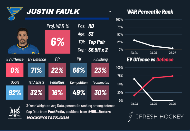 Faulk is old and his contract is high in cap. Sure, there’s only another season left after this but there’s a lot of risk here. People will look at the offensive output he has this season with 10 goals and 10 assists 38 games in. That’s a mirage however, and the Blues likely know it too and are going to try to sell high on him.