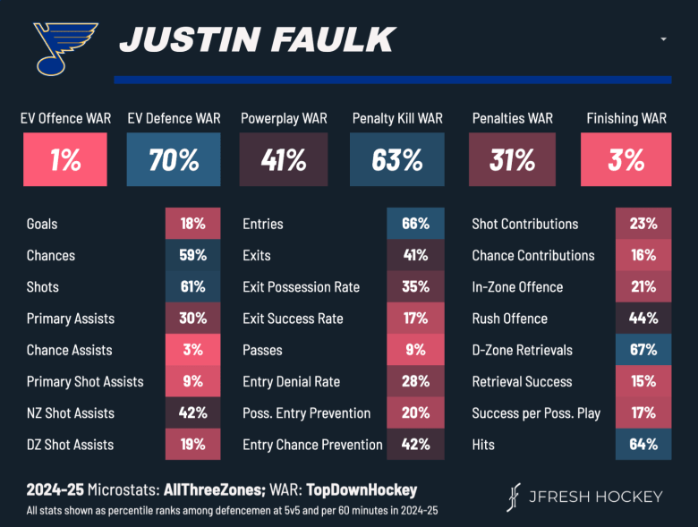 Faulk has yet to have a season above 50 xG% since 2019–2020. The Blues possession stats have averaged in the mid 40’s since his arrival and have been constantly outscored when he’s on the ice. The same rings true for this sason.