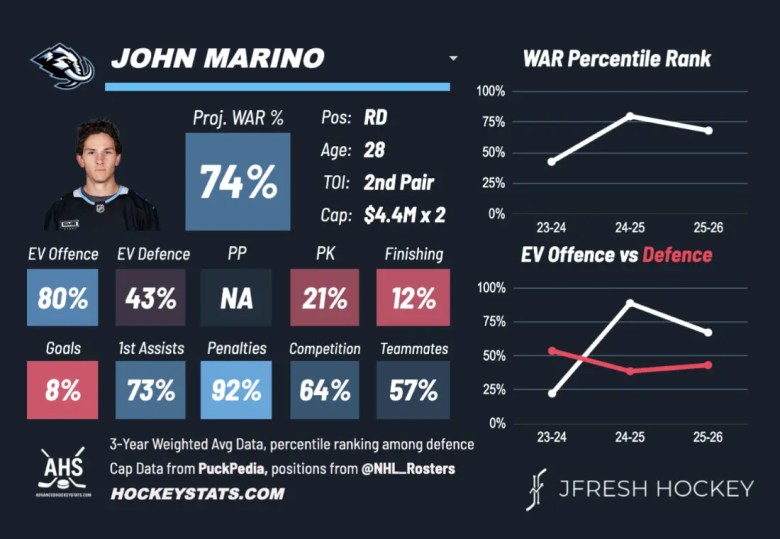 In Pittsburgh, Marino played with Marcus Petttersson every year. In 2019–20, the pair had a 51 xG%, a 52.3% in 20/21 and a 52.71 xG%.