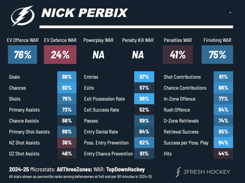 Perbix was someone I wanted back in free agency and ended up signing with the Predators. Perbix is just a smart hockey player. He excels at generating offence for his team, a great breakout passer, retreives the puck well, defends the blueline, and can carry the puck out of the zone with ease. He’s like a mini John Marino but just worse than everything John does well.