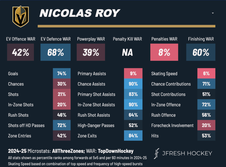 Roy hovered around the 52 xG% mark during his time in Vegas but that has since cratered to 42.59% with the Leafs. However, this is mostly due to the Leafs as a whole doing horrendous as team as Craig Berube’s system relies on a dump and chase, cycling for low danger shots.