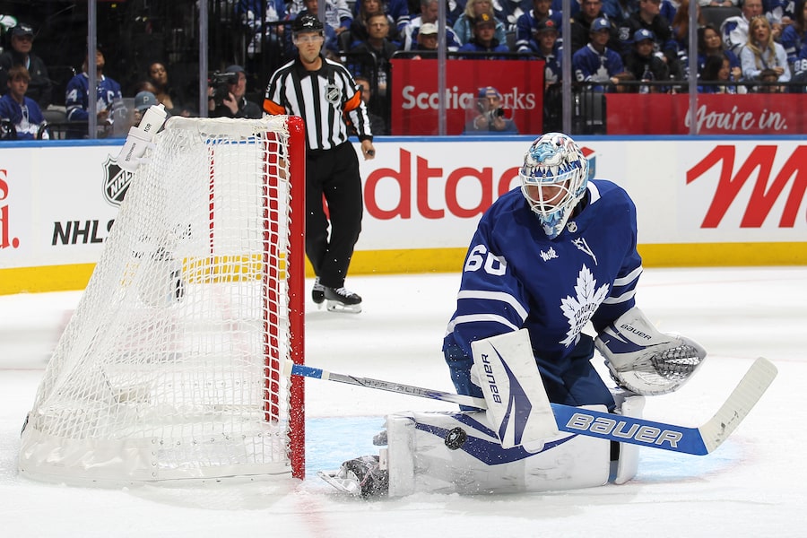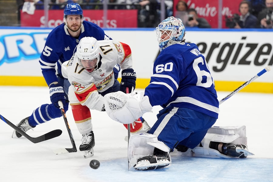 Joseph Woll of the Toronto Maple Leafs makes a save against the Florida Panthers during the first period.Claus Andersen/Getty Images