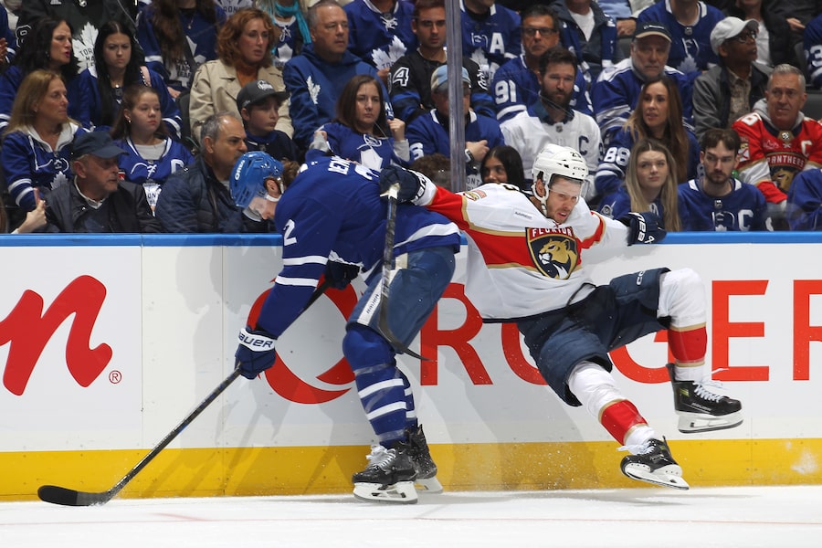 Simon Benoit of the Toronto Maple Leafs checks Carter Verhaeghe of the Florida Panthers during the first period.Claus Andersen/Getty Images