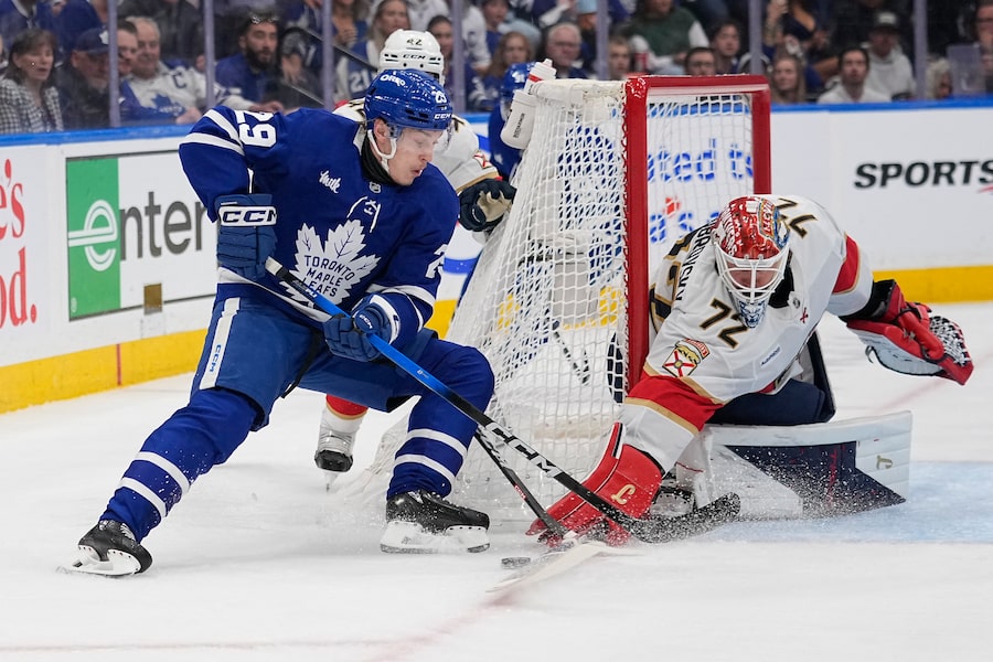 Sergei Bobrovsky of the Florida Panthers defends the goal against Bobby McMann and Max Pacioretty of the Toronto Maple Leafs.Claus Andersen/Getty Images