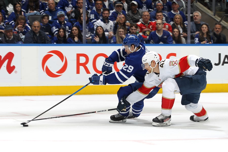 Pontus Holmberg of the Toronto Maple Leafs battles for the puck against Gustav Forsling of the Florida Panthers during the second period.Claus Andersen/Getty Images