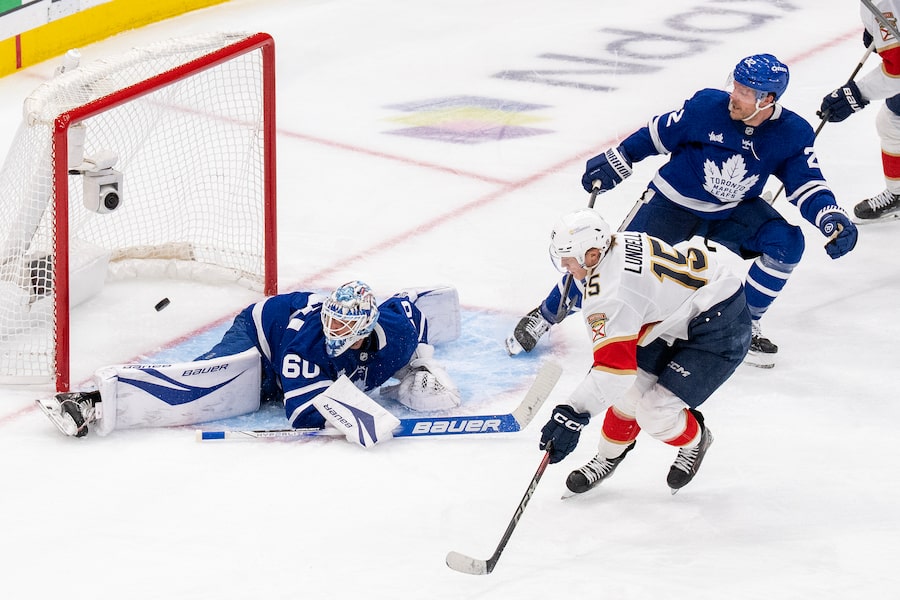 Florida Panthers centre Anton Lundell scores on Toronto Maple Leafs goaltender Joseph Woll during the second period.Chris Young/The Canadian Press