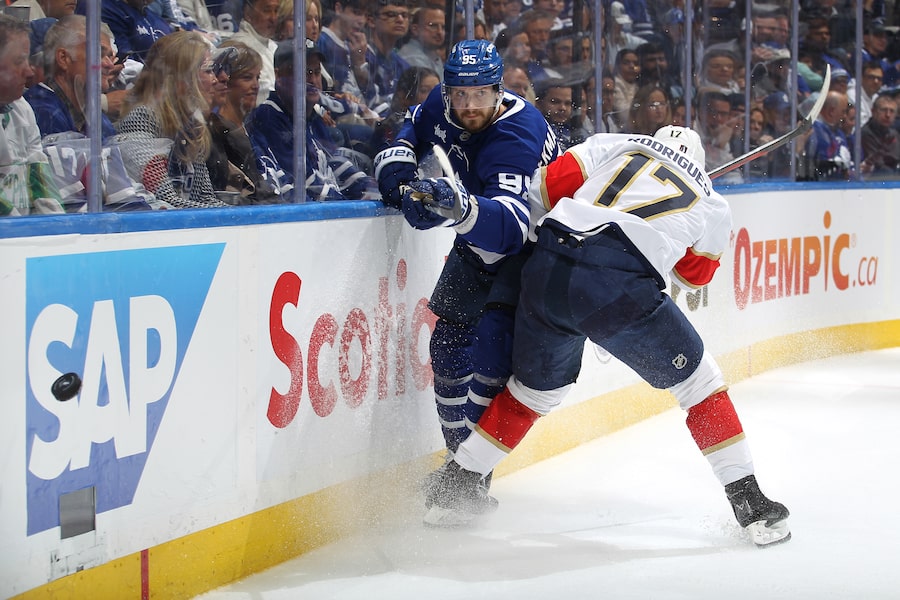 Oliver Ekman-Larsson of the Toronto Maple Leafs battles against Evan Rodrigues of the Florida Panthers during the first period.Claus Andersen/Getty Images