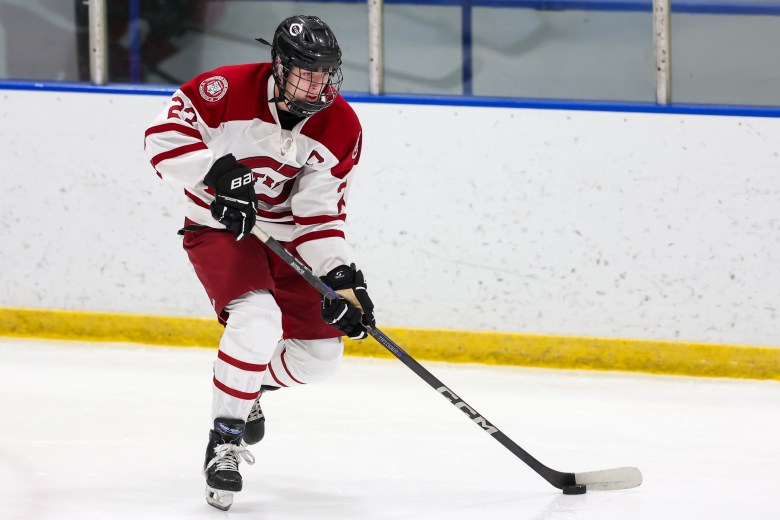 Concord senior center Chad LaRiviere (23) advances the puck up the ice against Trinity. Credit: RICH MIYARA / NH Sports Photography