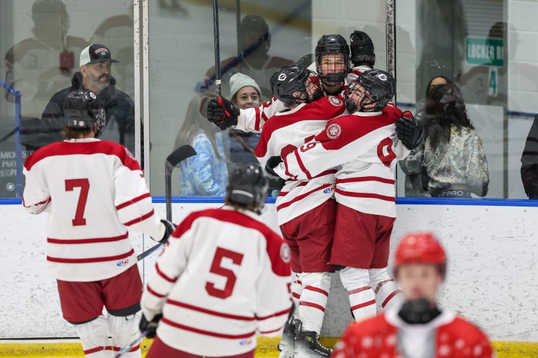 Concord senior Tyler Morin (15) is swarmed by teammates Tyler Mayo (24), Nolan Walsh (9), Brayden Beauregard (7) and Reece Mounsey (5) after scoring a first period goal. Credit: RICH MIYARA / NH Sports Photography