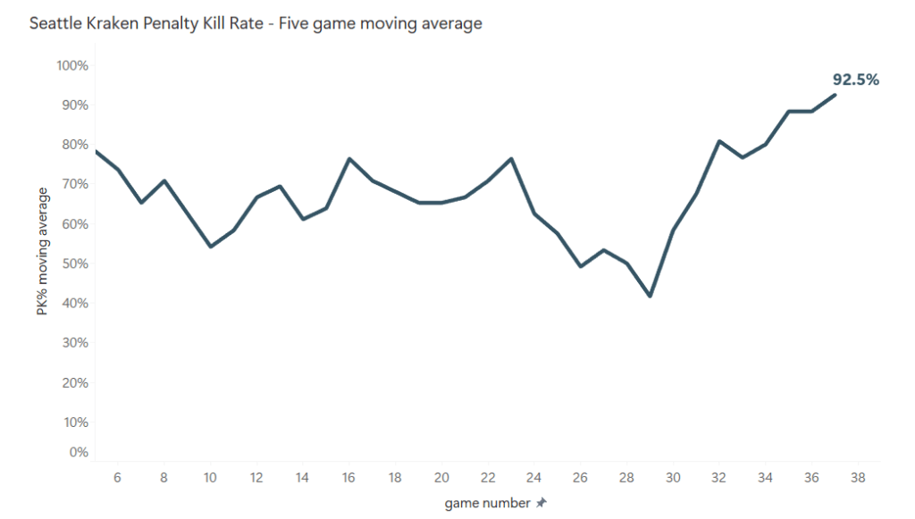 However… since that three‑game disaster, the penalty kill has actually been quite good. From that point forward, the Kraken have killed 85.7 percent of their shorthanded situations, the sixth‑best mark in the league since Dec. 7. Here is a look at how the penalty kill has performed over the season by looking at a five-game moving average.
