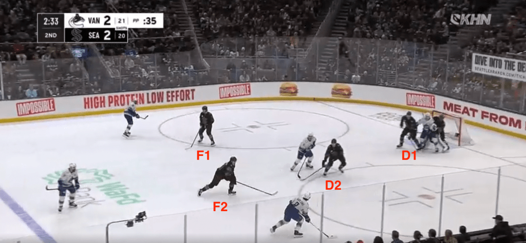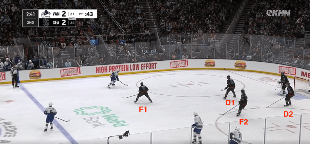 The main reason this works so much better is that there are now two players across the middle of the ice, instead of a triangular formation that placed two players near the crease and one in the slot. When a puck is contested along the wall, the diamond quickly spreads as Seattle’s skaters pounce and try to advance it out of the zone. If they lose possession, they retreat right back into position, with minimal confusion about assignments.