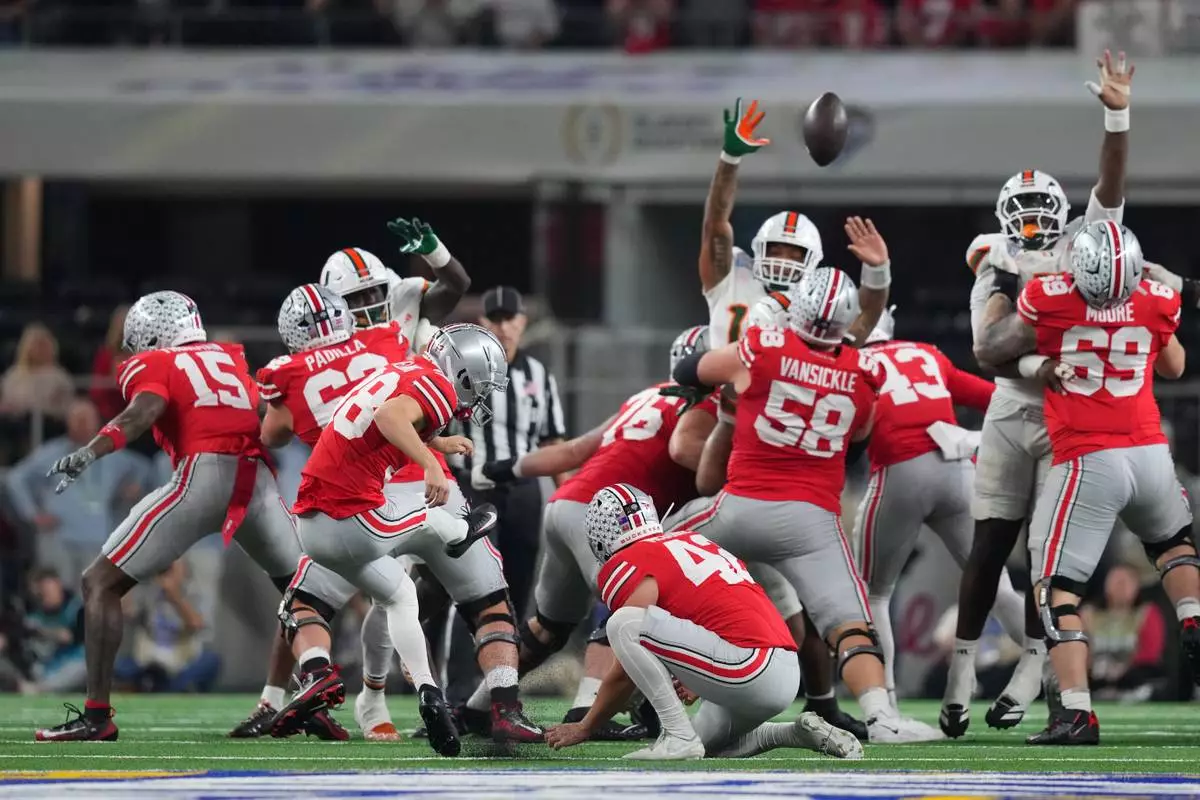 No. 10 Miami held on for a 24-14 victory in the Cotton Bowl quarterfinal Wednesday night, taking a two-touchdown halftime lead and bouncing the third-ranked Buckeyes (12-2, No. 2 CFP seed) a year after Ohio State had to play in the first round and won four playoff games on the way to the title.