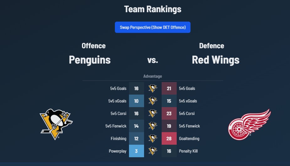 Both teams have been top-half of the league in shot-tracked metrics in terms of 5v5 Corsi, Fenwick and expected goals. Both are bottom-half of the league in terms of 5v5 Corsi, Fenwick and expected goals against. Both have very good power plays and middle-of-the-road penalty kills. There are some differences; Detroit has struggled to finish chances, which results in a weak 5v5 actual goals. The Penguins have had better overall goaltending, though that number could be said to be stronger than the current goaltending on hand.