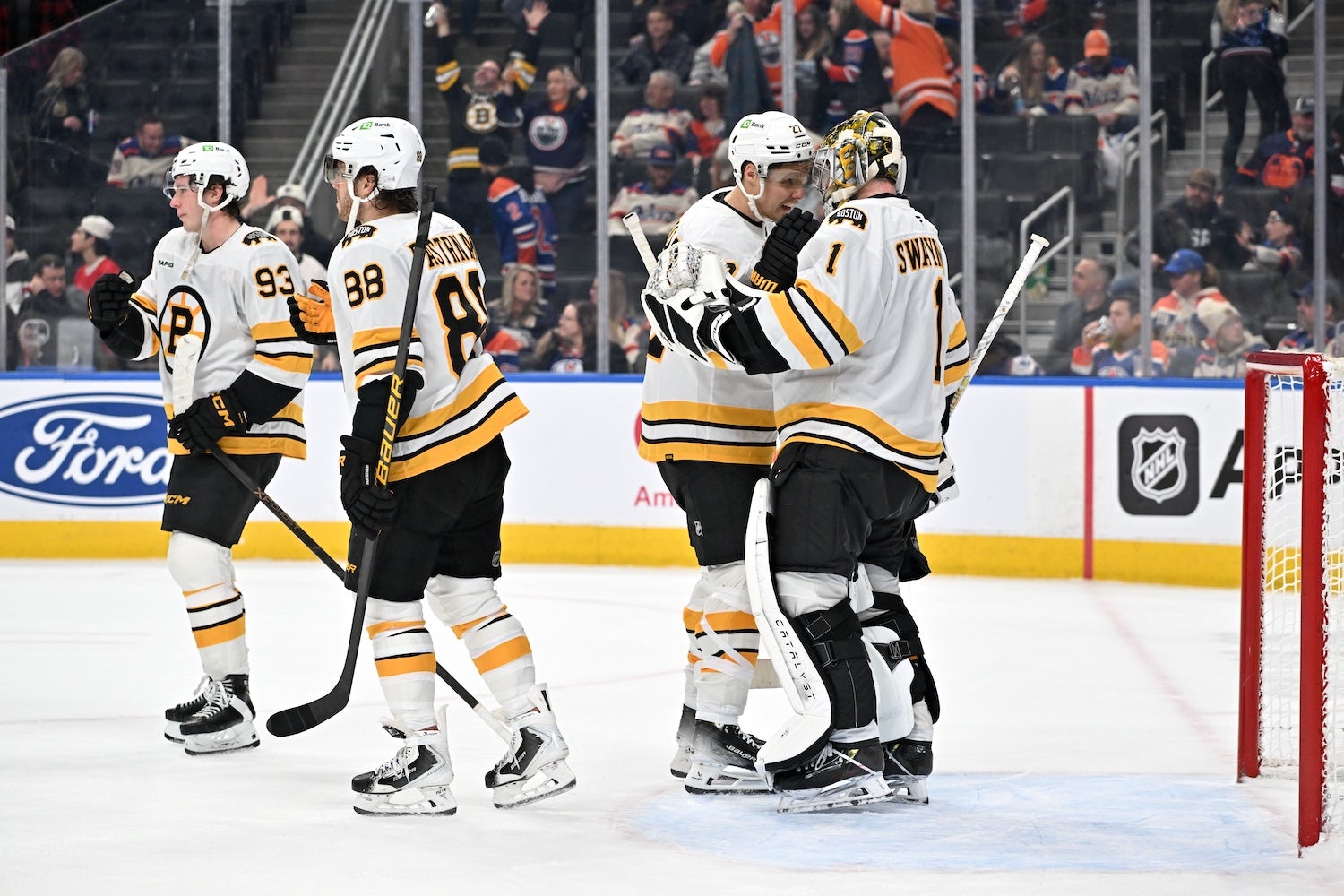 Dec 31, 2025; Edmonton, Alberta, CAN; David Pastrnak (88), Fraser Minten (93), defenseman Hampus Lindholm (27), and goalie Jeremy Swayman (1) celebrate a win at Rogers Place. (Walter Tychnowicz-Imagn Images)