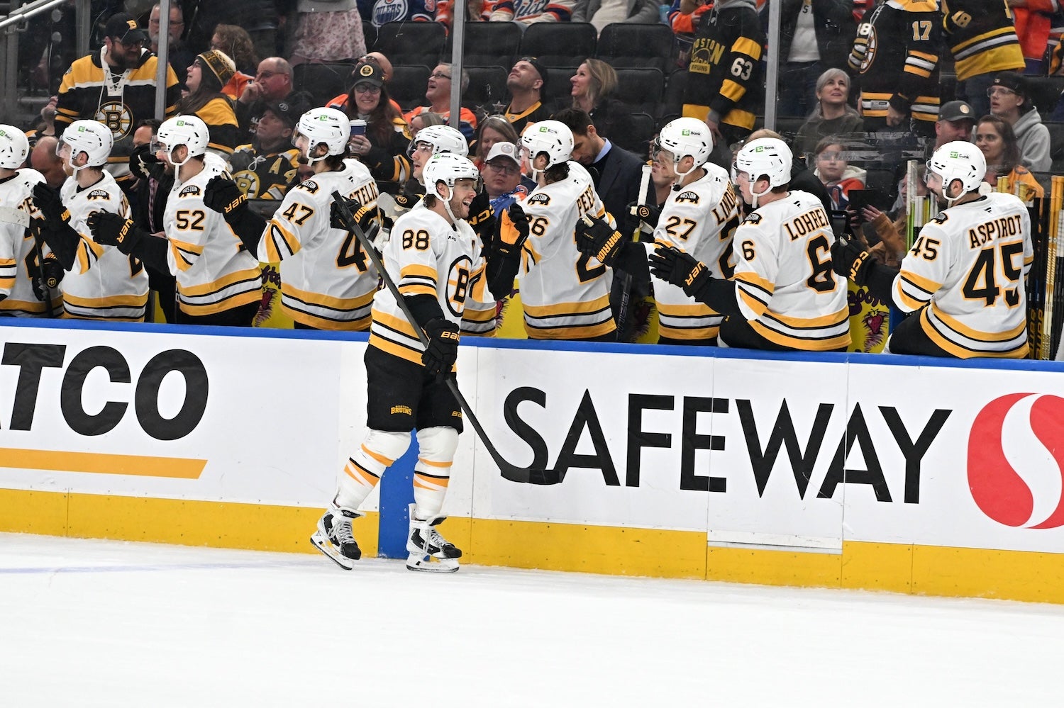 Dec 31, 2025; Edmonton, Alberta, CAN; Bruins right winger David Pastrnak (88) celebrates a goal with team mates in the third period against the Oilers at Rogers Place. (Walter Tychnowicz/Imagn Images)