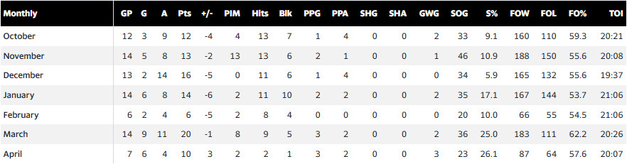 Crosby saw a nine goal drop off from a season ago, but his assist numbers shot up this season, finishing 15th overall league wide and 10th overall in points. Even 20 years in he still doesn’t shoot enough, but assists have always been his bread and butter.
