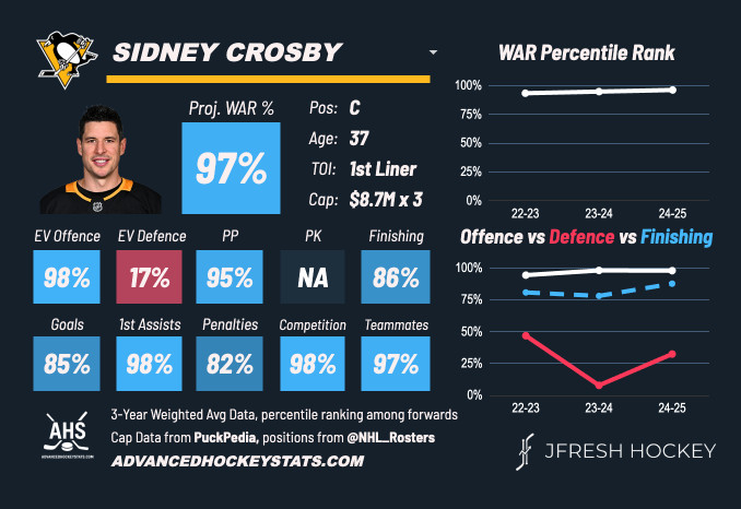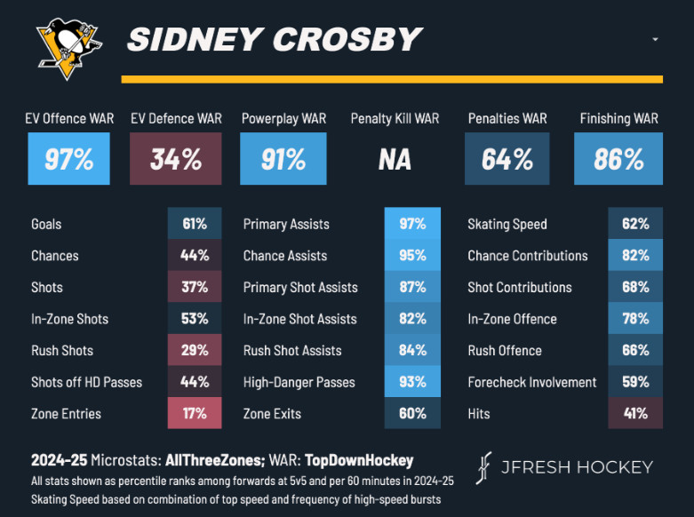 Still an offensive force in his 20th season, Crosby produces at an elite level like we all know and the underlying numbers back that up. His play in the defensive zone is the weakest part of his game but that has been the case for a few seasons now, but even those numbers did jump in 2024-25 from a career worst a season ago.