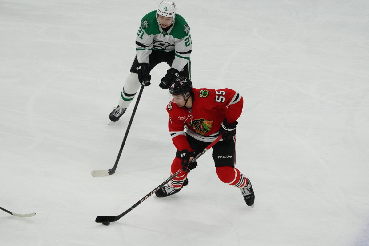 Jan 1, 2026; Chicago, Illinois, USA; Dallas Stars left wing Jason Robertson (21) defends Chicago Blackhawks defenseman Artyom Levshunov (55) during the third period at United Center. Mandatory Credit: David Banks-Imagn ImagesCredit: David Banks-Imagn Images