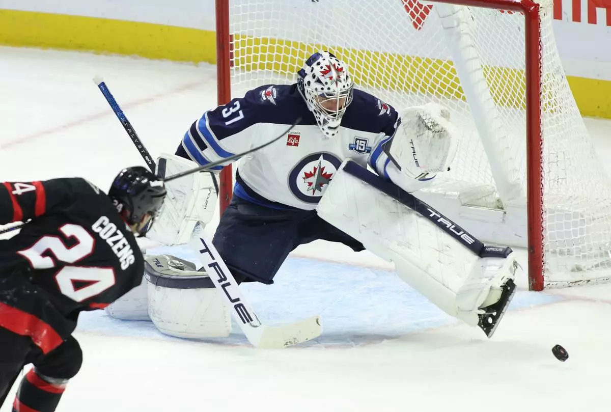 Winnipeg Jets goaltender Connor Hellebuyck (37) makes a save on a shot by Ottawa Senators’ Dylan Cozens (24) during the second period of an NHL hockey game in Ottawa, Ontario, on Saturday, Jan. 3, 2026. (Patrick Doyle/The Canadian Press via AP)