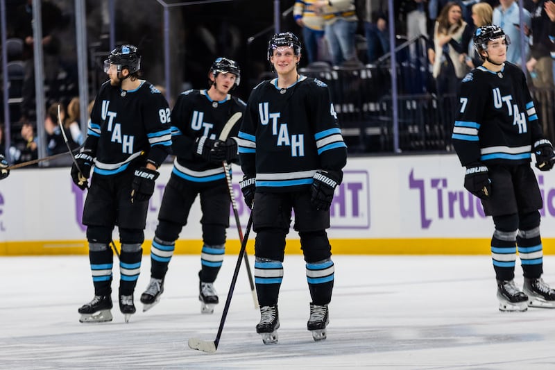 Utah Hockey Club defenseman Juuso Valimaki (4), center, smiles after winning 4-2 against the St. Louis Blues during an NHL game held at the Delta Center in Salt Lake City on Saturday, Jan. 18, 2025. | Tess Crowley, Deseret News