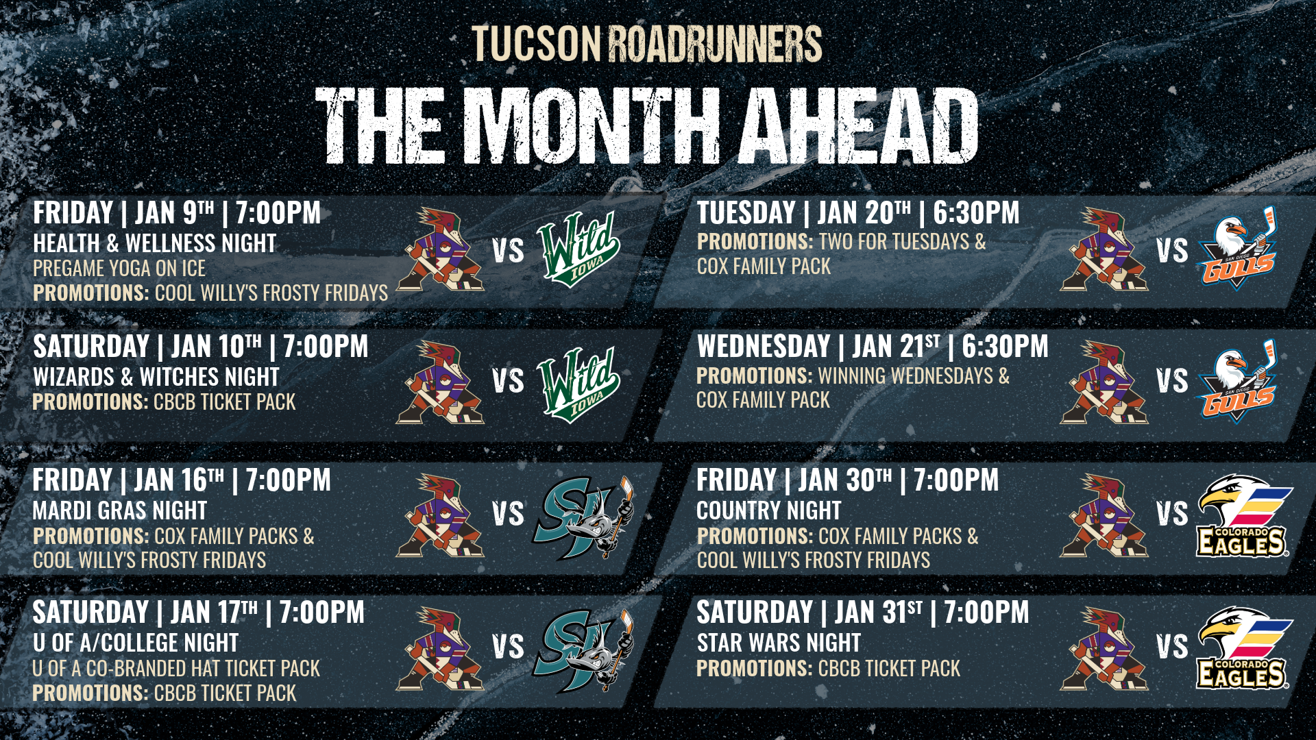 Tucson’s January home schedule kicks off with a six-game homestand: the Iowa Wild visit on Jan. 9–10, the San Jose Barracuda on Jan. 16–17 and the San Diego Gulls on Jan. 20–21. The Wild make their first and only regular-season trip to Southern Arizona, and the Barracuda return for their first of two visits to Tucson Arena.