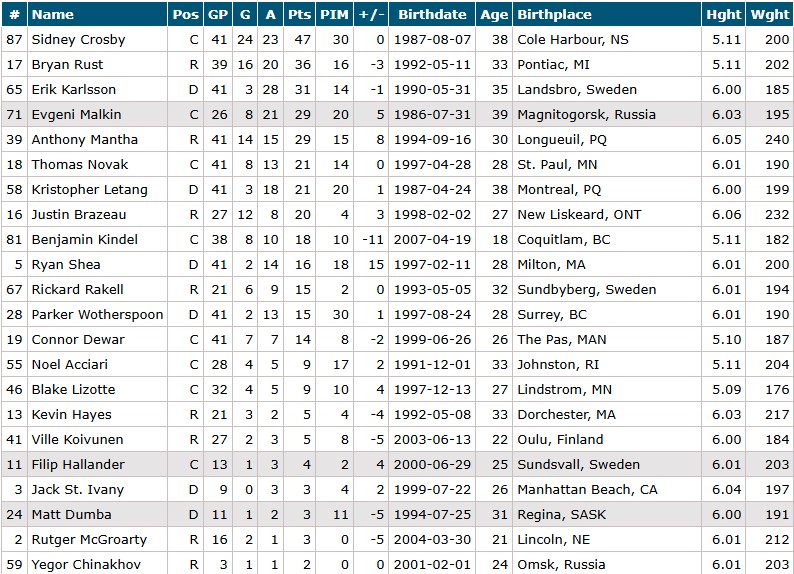 The Penguins have reached the halfway point of the season, the top part of their leading scorers looks like this via hockeydb.