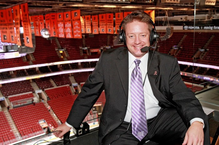 Longtime Philadelphia Flyers announcer Tim Saunders was recently suspended for an off-color remark he made during what he thought was a commercial break. “While you’re down there, would you mind blowing me?” he joked with his on-air partner, ex-Flyer Todd Fedoruk, before discovering his hot mic caught the entire moment.