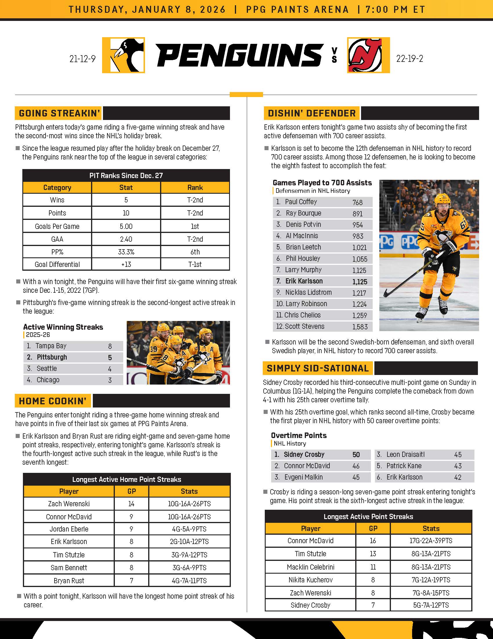 The Penguins are red hot with a 5-0-0 record since Christmas (December 25). They rank near the top in multiple statistical categories around the League:
