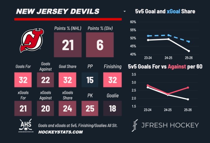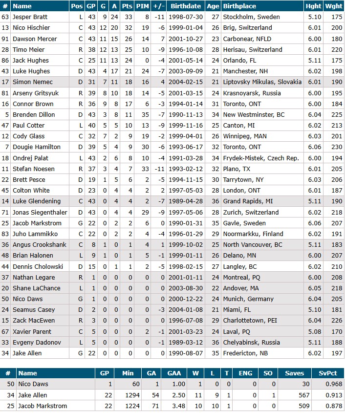 The good news is that it looks like Nemec could return for his first game since December 11th after coming off an injury. Cotter, too, looks like he’s approaching a return.Palat has been moved down to the fourth line.No news on a goalie, but you’d have to think Jake Allen will be going tonight. He’s been the better of the two goalies this season, and somewhat shockingly, the Devils left Markstrom in to crash and burn when he allowed all nine of the goals in the 9-0 loss on Tuesday. They didn’t play Monday or Wednesday, so that certainly was an interesting choice to keep a struggling goalie twisting in the wind like that.This is ugly. 80 different skaters on 30 out of the 32 teams have 13+ goals this season, only Calgary and New Jersey aren’t represented. 70 different skaters making up 27 of the 32 teams have at least 34+ points, the Devils again are in the handful that don’t. Those numbers are cherrypicked for maximum effect, the overall meaning remains stark to not have even one of the top 70 point scorers or be anywhere within the top 80 goal scorers so far, that’s a terrible place to be midway into the year.As you’d expect, the underperformers are everywhere. Jesper Bratt scored 88 points last season, Nico Hischier had 35 goals, both are way under that. Jack Hughes and Timo Meier combined for 123 points last season, they have 49 together so far. Expensive veterans like Ondrej Palat and Jacob Markstrom have looked more like the problem than solution.