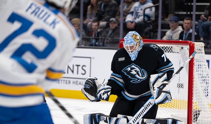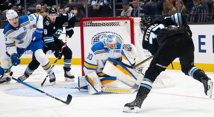 St. Louis Blues goaltender Joel Hofer (30) blocks a shot by Utah Mammoth right wing JJ Peterka (77) as the Mammoth and Blues play at the Delta Center in Salt Lake City on Friday, Jan. 9, 2026. | Scott G Winterton, Deseret News
