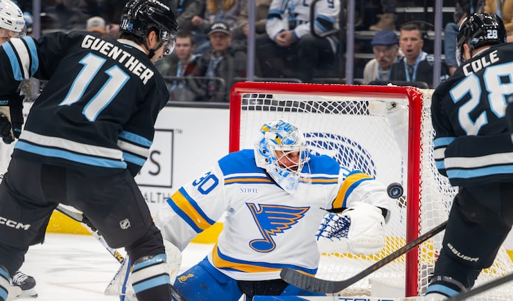 St. Louis Blues goaltender Joel Hofer (30) knocks the puck away as Utah Mammoth right wing Dylan Guenther (11) and Utah Mammoth defenseman Ian Cole (28) work to get it in the goal as the Mammoth and Blues play at the Delta Center in Salt Lake City on Friday, Jan. 9, 2026. | Scott G Winterton, Deseret News