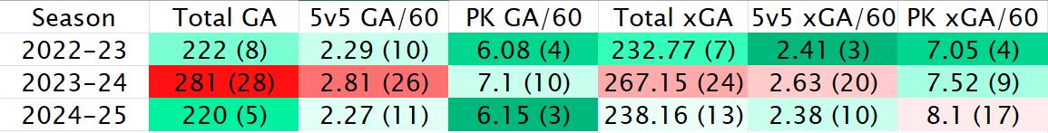 2020-21: .897 team SV%, 3.16 GAA (LG average: .908 SV%)2021-22: .886 team SV%, 3.52 GAA (LG average: .907 SV%)2022-23: .908 team SV%, 2.56 GAA (LG average: .904 SV%)2023-24: .896 team SV%, 3.12 GAA (LG average: .903 SV%)2024-25: .904 team SV%, 2.51 GAA (LG average: .900 SV%)2025-26: .896 team SV%, 3.09 GAA (LG average: .897 SV%)
