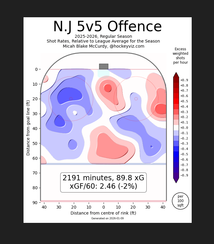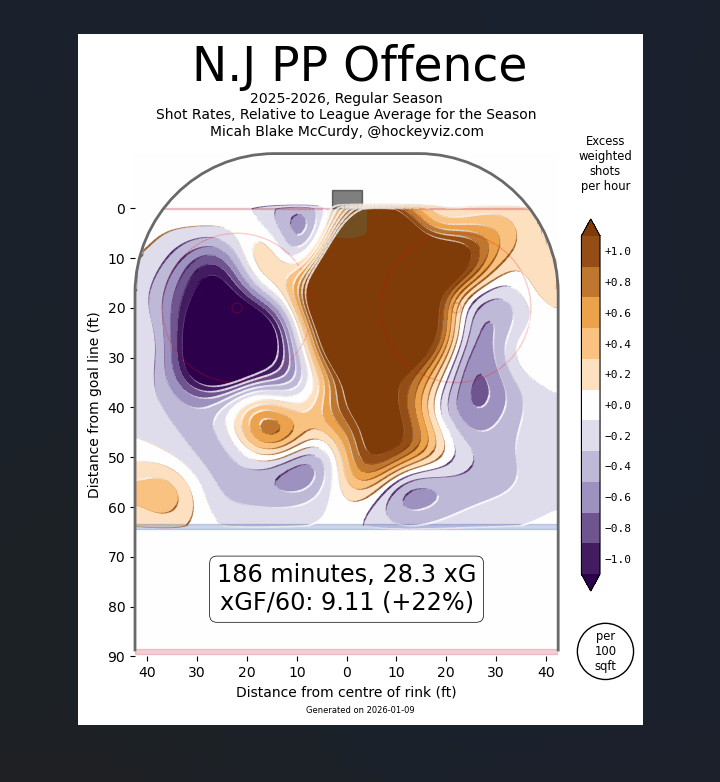 Do you want to guess where HockeyViz notes the Devils have their best finishing? It’s when they take slap shots in the left circle: right where they take the fewest shots on their power play and at five-on-five.