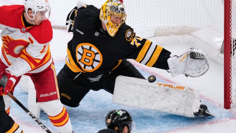 Boston Bruins goaltender Joonas Korpisalo (70) reaches for a save during the second period of an NHL hockey game against the Calgary Flames, Thursday, Jan. 8, 2026, in Boston. (AP Photo/Charles Krupa) AP